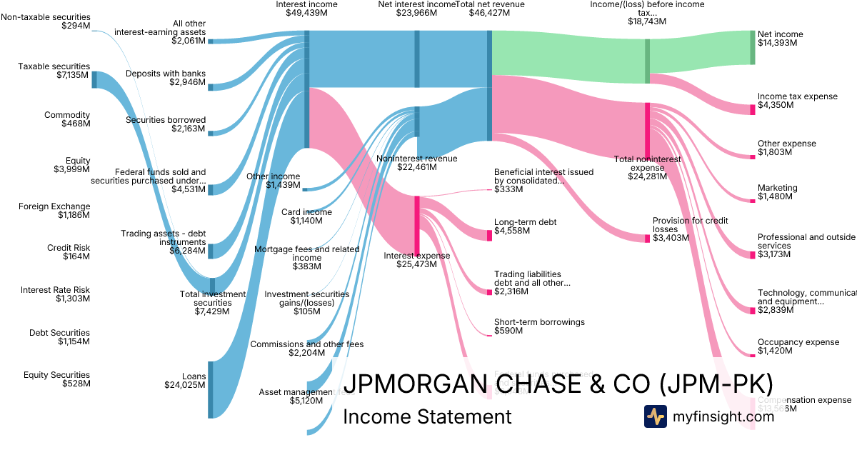 For the quarter ending 2025-09-30, JPM-PK made $46,427M in revenue. $14,393M in net income. Net profit margin of 31.00%.