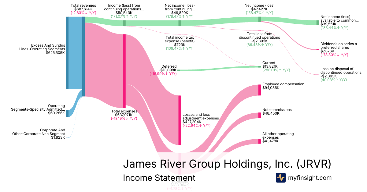 For the year ending 2025-12-31, JRVR made $687,614K in revenue. $39,551K in net income. Net profit margin of 5.75%.