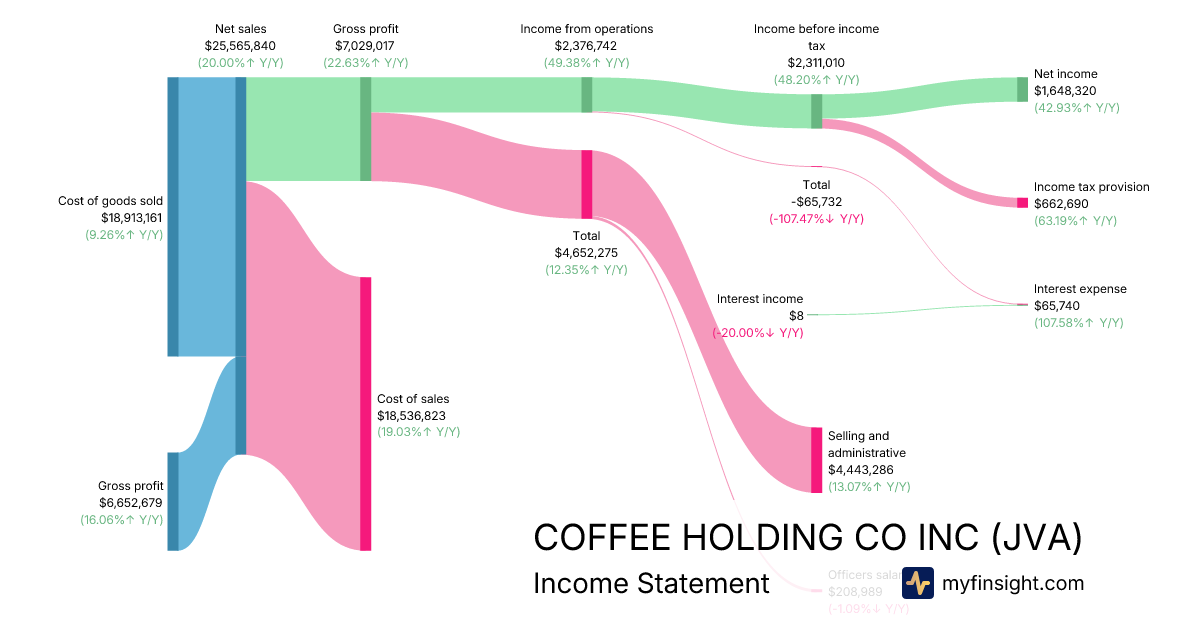 For the quarter ending 2026-01-31, JVA made $25,565,840 in revenue. $1,648,320 in net income. Net profit margin of 6.45%.