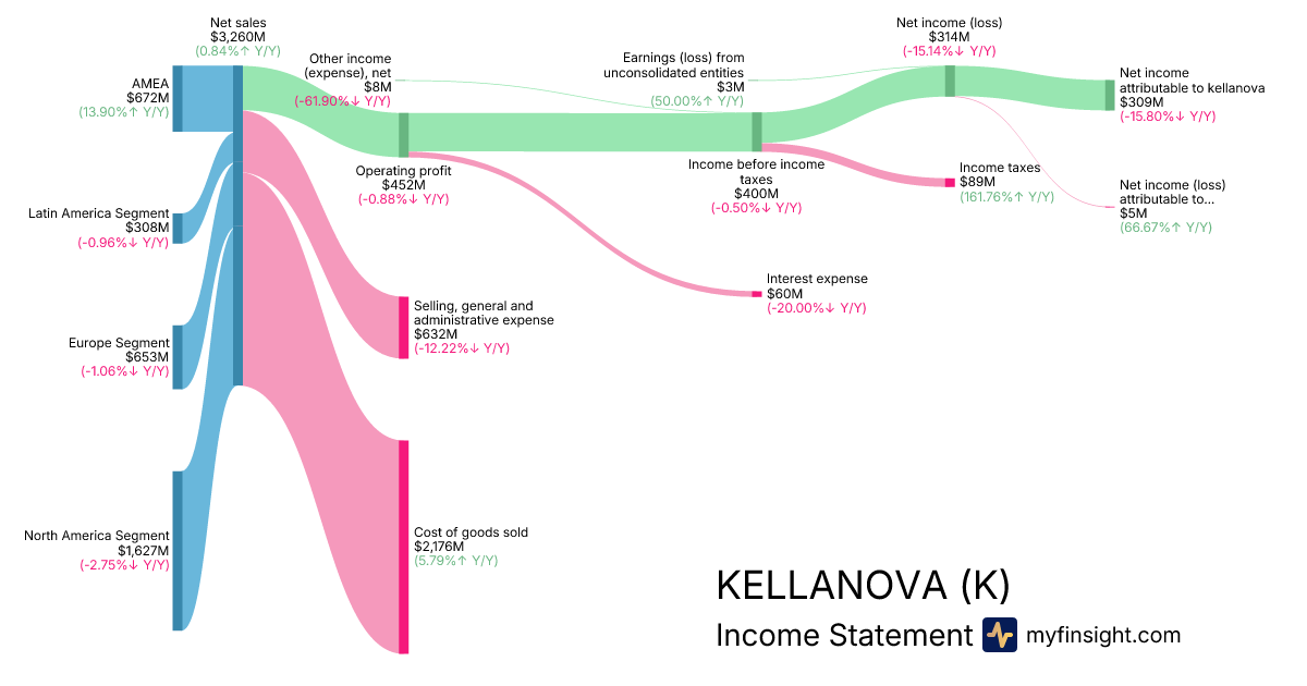 For the quarter ending 2025-09-27, K made $3,260M in revenue. $309M in net income. Net profit margin of 9.48%.