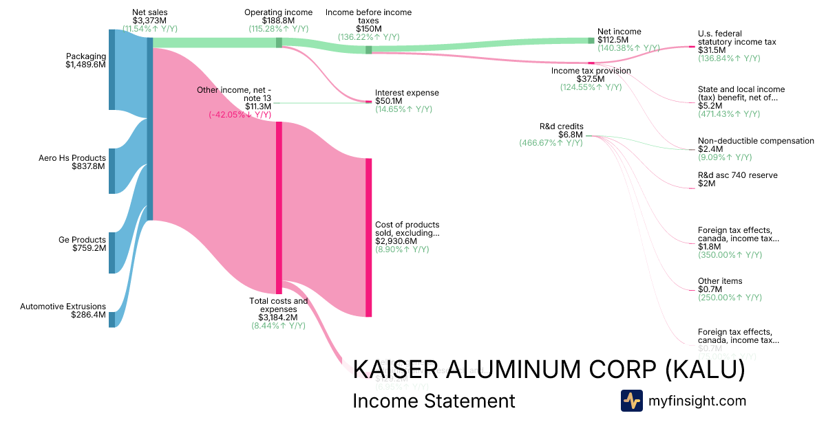 For the year ending 2025-12-31, KALU made $3,373M in revenue. $112.5M in net income. Net profit margin of 3.34%.