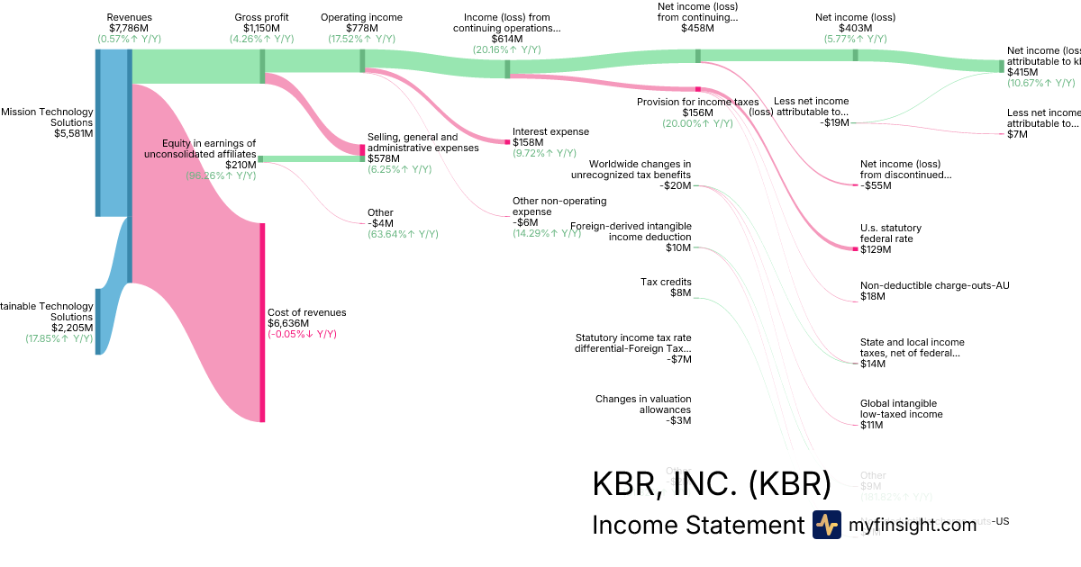 For the year ending 2026-01-02, KBR made $7,786M in revenue. $415M in net income. Net profit margin of 5.33%.