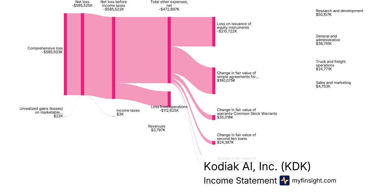 For the year ending 2025-12-31, KDK made $3,797K in revenue. -$585,503K in net income. Net profit margin of -15420.15%.