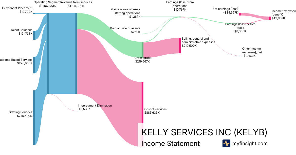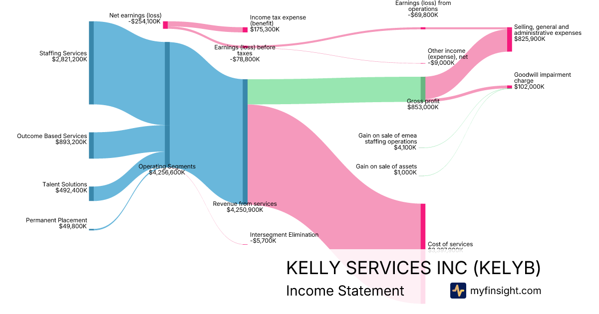 For the year ending 2025-12-28, KELYB made $4,250,900K in revenue. -$254,100K in net income. Net profit margin of -5.98%.