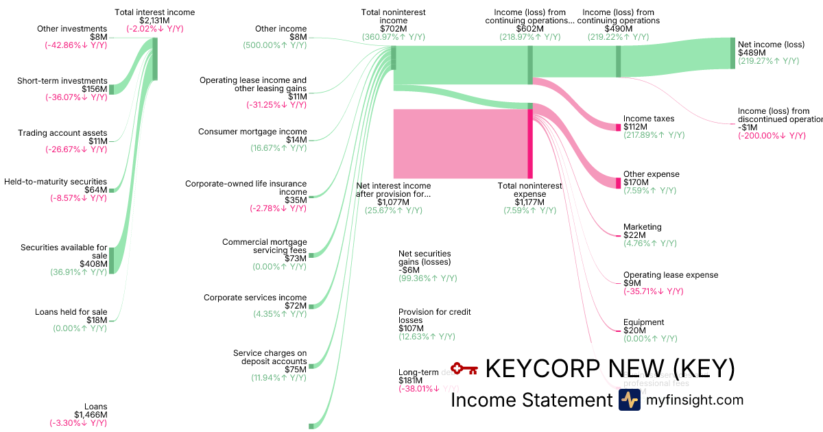 For the quarter ending 2025-09-30, KEY made $4,963,000K in revenue. $489,000K in net income. Net profit margin of 9.85%.