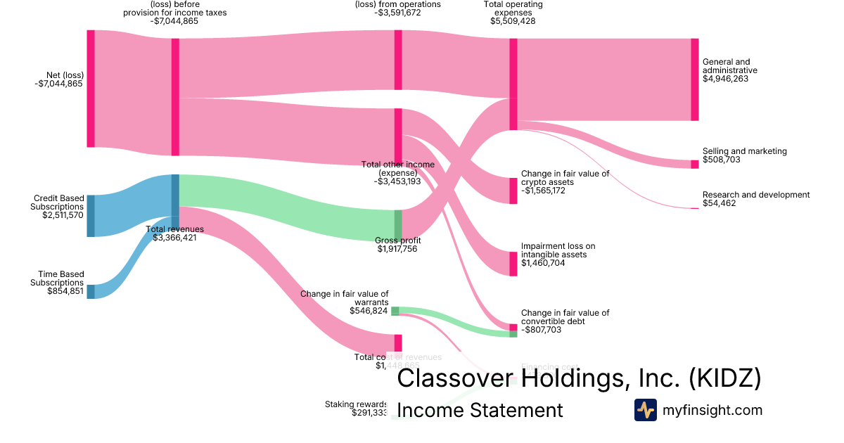 For the year ending 2025-12-31, KIDZ made $3,366,421 in revenue. -$7,044,865 in net income. Net profit margin of -209.27%.
