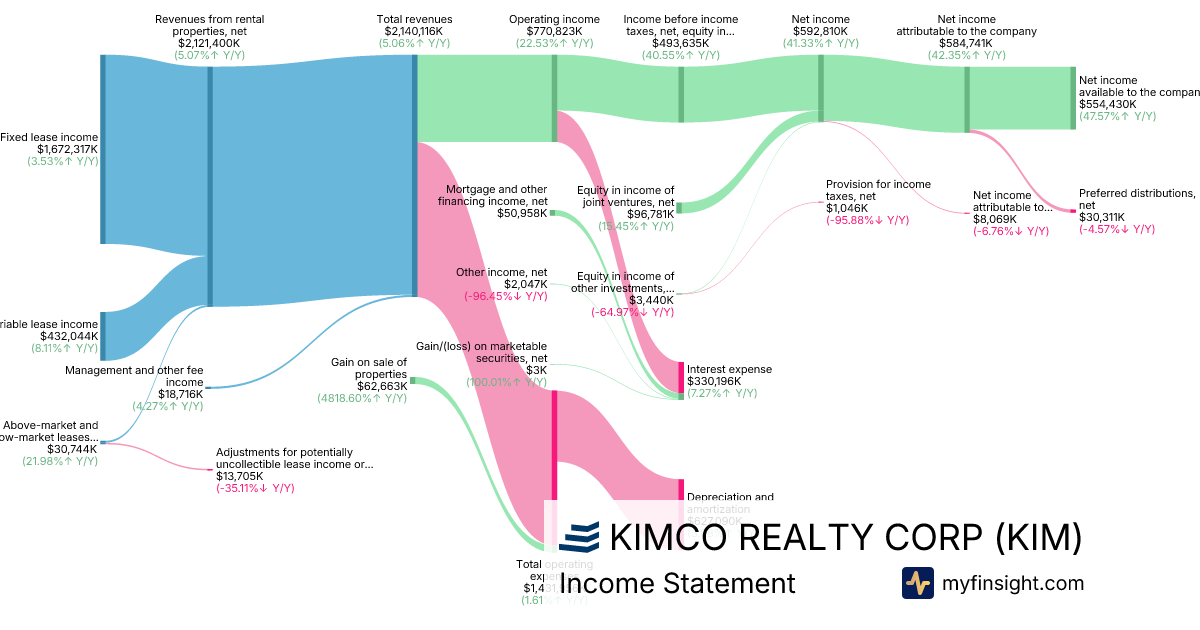 For the year ending 2025-12-31, KIM made $2,140,116K in revenue. $554,430K in net income. Net profit margin of 25.91%.