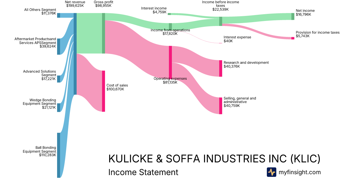 For the quarter ending 2026-01-03, KLIC made $199,625K in revenue. $16,796K in net income. Net profit margin of 8.41%.