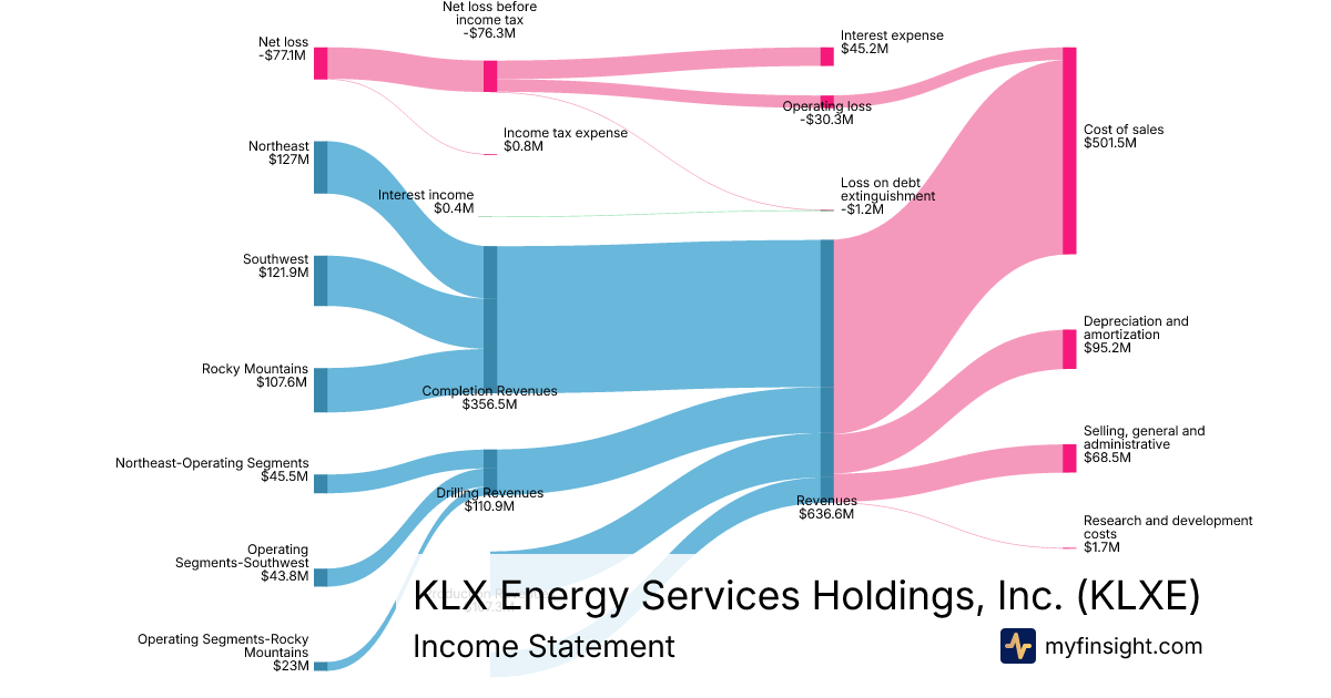For the year ending 2025-12-31, KLXE made $636.6M in revenue. -$77.1M in net income. Net profit margin of -12.11%.