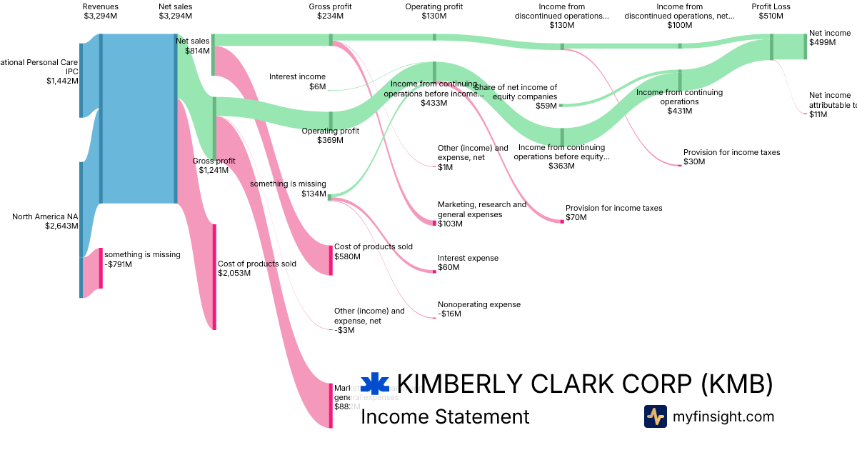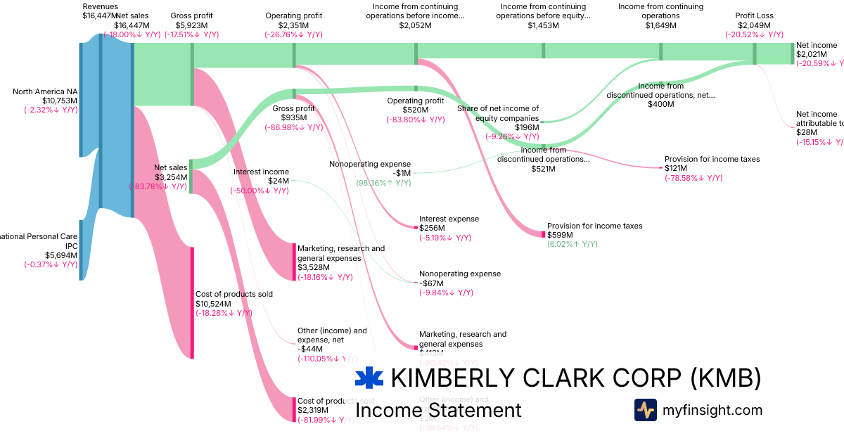 For the year ending 2025-12-31, KMB made $16,447M in revenue. $2,021M in net income. Net profit margin of 12.29%.
