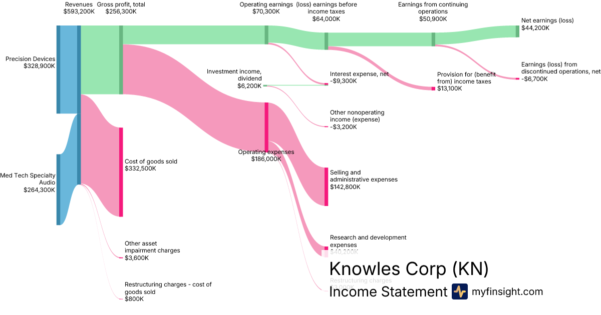 For the year ending 2025-12-31, KN made $593,200K in revenue. $44,200K in net income. Net profit margin of 7.45%.