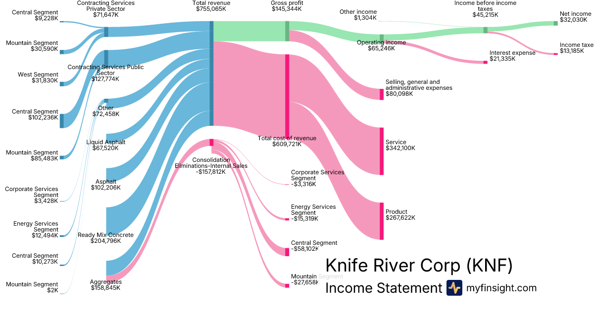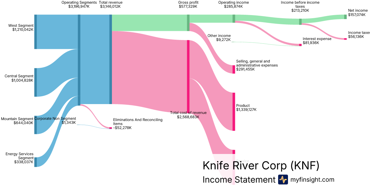 For the year ending 2025-12-31, KNF made $3,146,012K in revenue. $157,074K in net income. Net profit margin of 4.99%.
