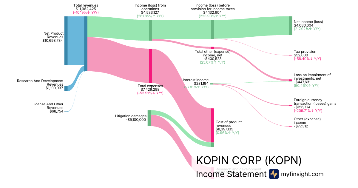 For the quarter ending 2025-09-27, KOPN made $11,962,425 in revenue. $4,080,604 in net income. Net profit margin of 34.11%.