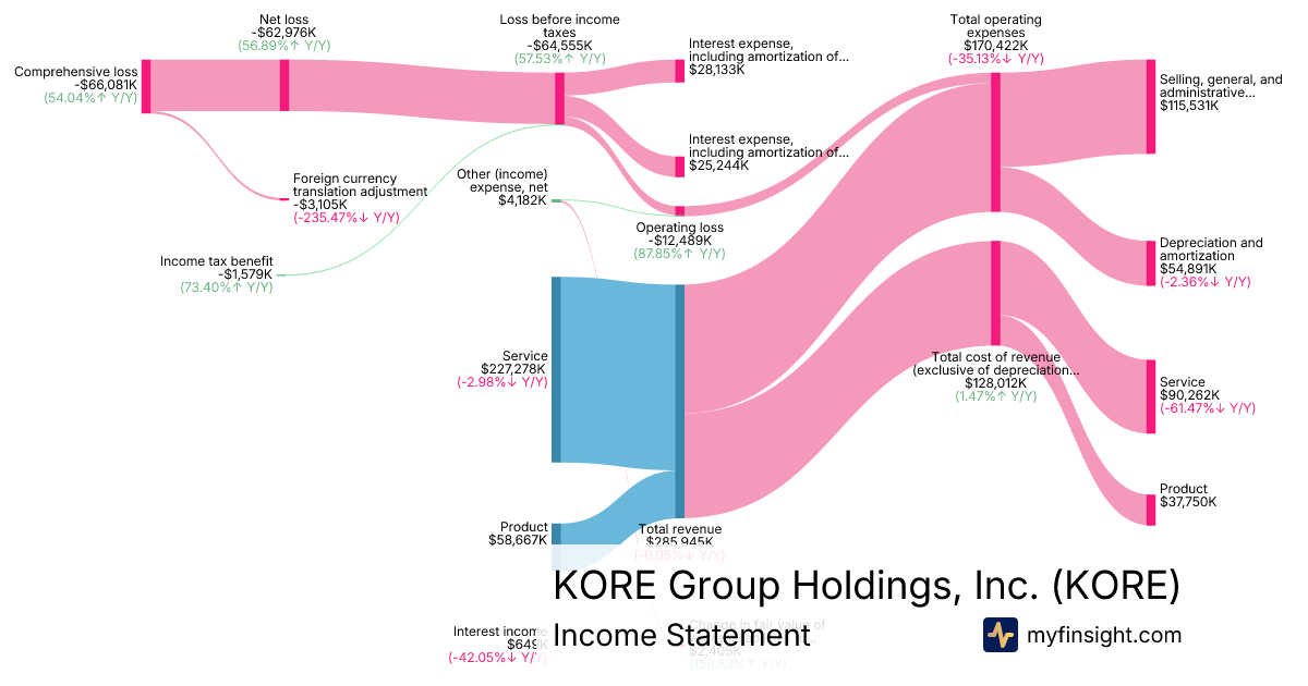 For the year ending 2025-12-31, KORE made $285,945K in revenue. -$66,081K in net income. Net profit margin of -23.11%.