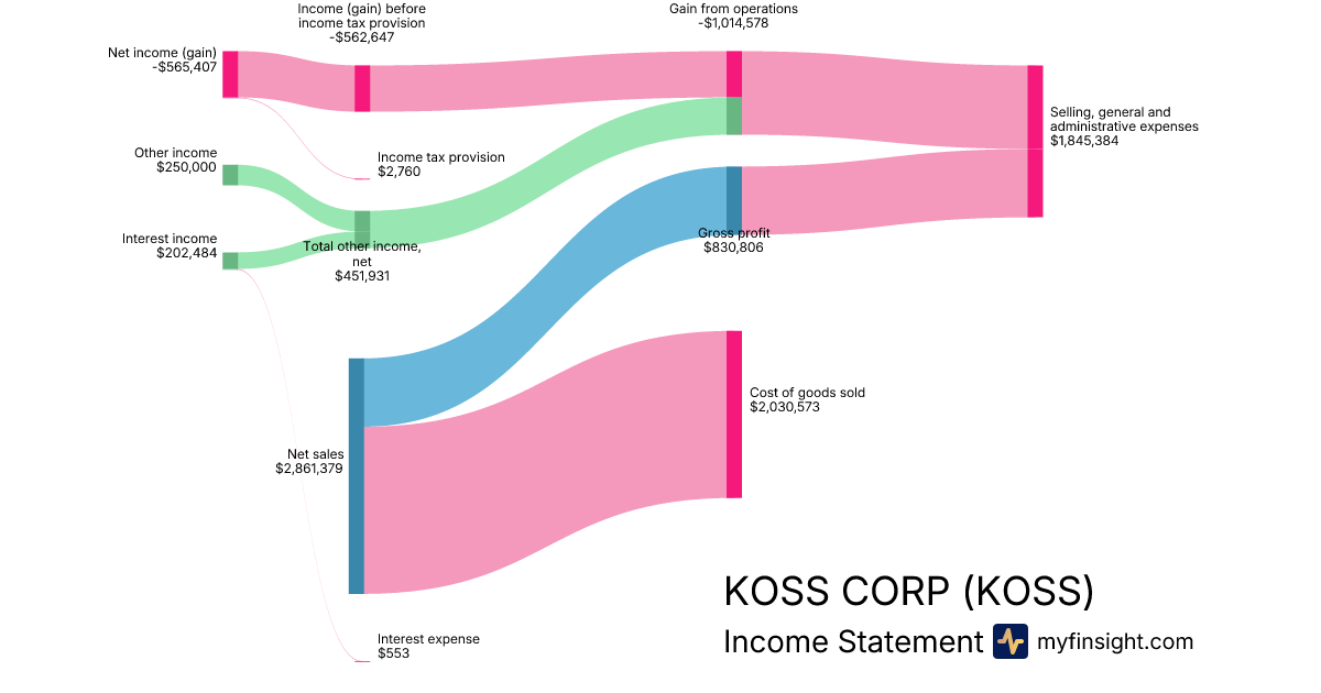 For the quarter ending 2025-12-31, KOSS made $2,861,379 in revenue. -$565,407 in net income. Net profit margin of -19.76%.