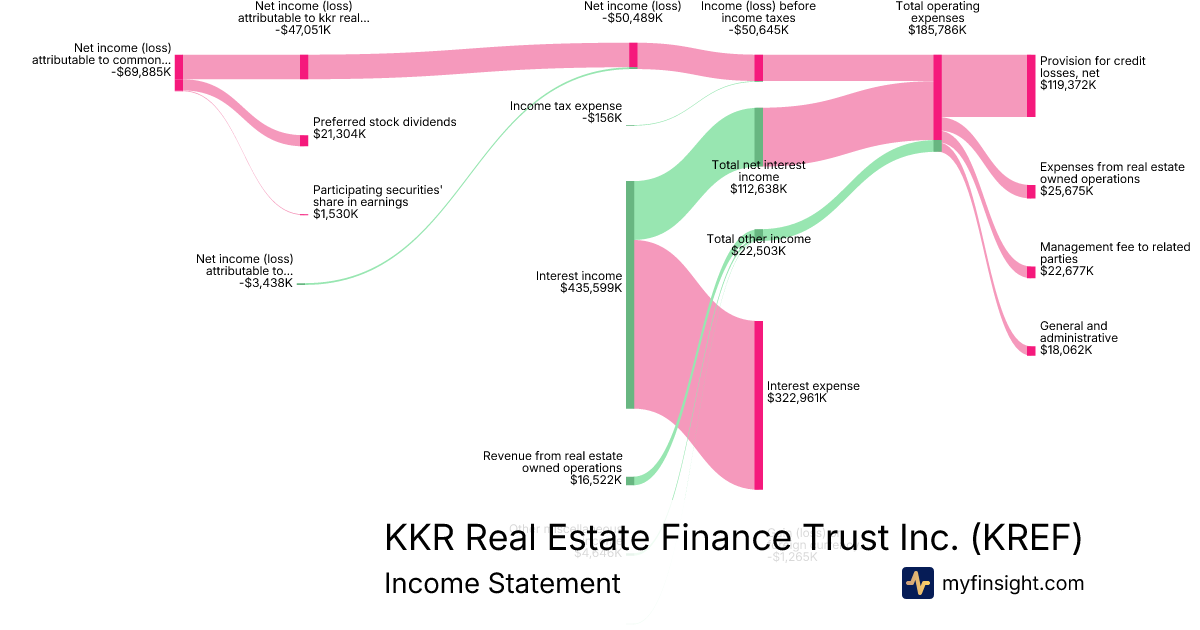 For the year ending 2025-12-31, KREF made $119,372K in revenue. -$69,885K in net income. Net profit margin of -58.54%.