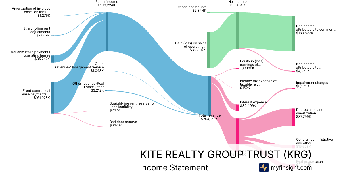 For the year ending 2025-12-31, KRG made $844,365K in revenue. $298,663K in net income. Net profit margin of 35.37%.
