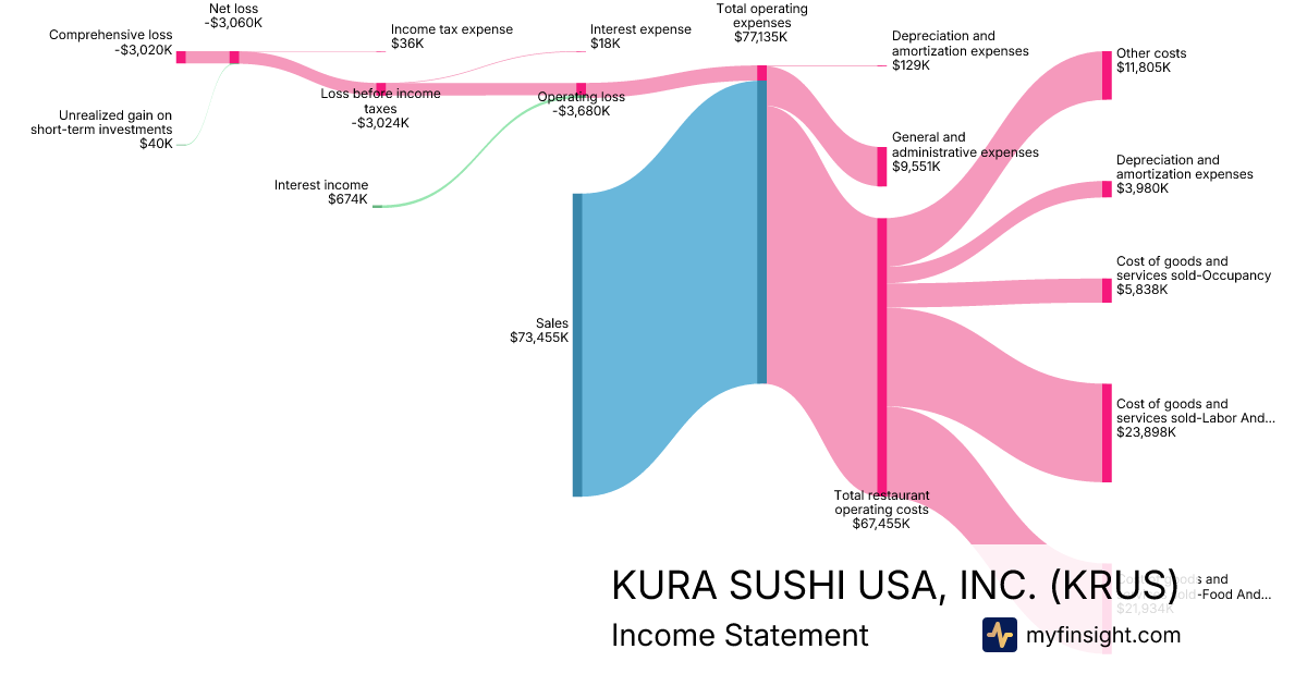 For the quarter ending 2025-11-30, KRUS made $73,455K in revenue. -$3,020K in net income. Net profit margin of -4.11%.