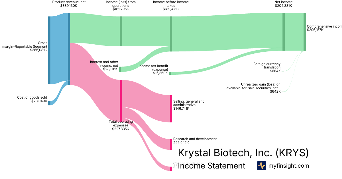 For the year ending 2025-12-31, KRYS made $389,130K in revenue. $206,157K in net income. Net profit margin of 52.98%.