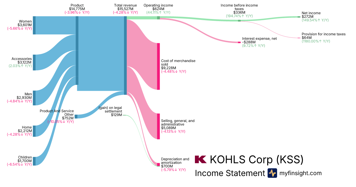 For the year ending 2026-01-31, KSS made $15,527M in revenue. $272M in net income. Net profit margin of 1.75%.