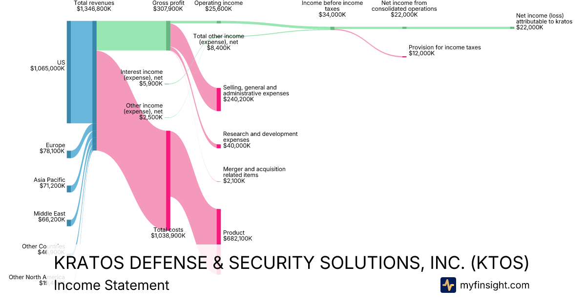 For the year ending 2025-12-28, KTOS made $1,346,800K in revenue. $22,000K in net income. Net profit margin of 1.63%.