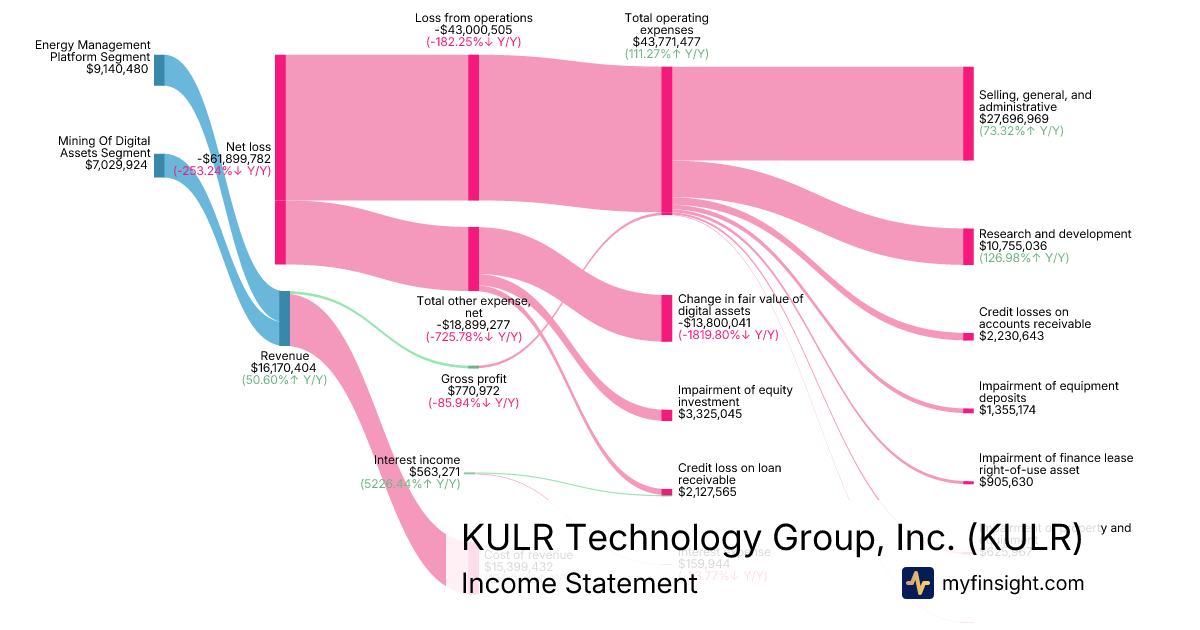 For the year ending 2025-12-31, KULR made $16,170,404 in revenue. -$61,899,782 in net income. Net profit margin of -382.80%.