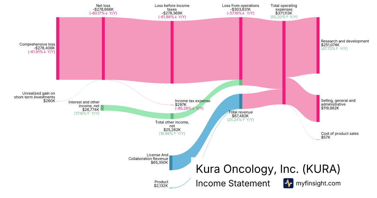 For the year ending 2025-12-31, KURA made $67,482K in revenue. -$278,406K in net income. Net profit margin of -412.56%.