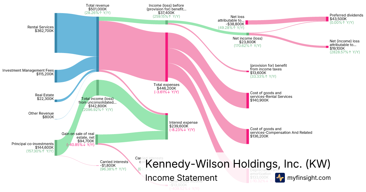 For the year ending 2025-12-31, KW made $501,000K in revenue. -$38,800K in net income. Net profit margin of -7.74%.