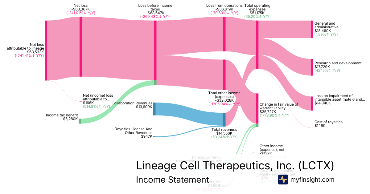 For the year ending 2025-12-31, LCTX made $14,556K in revenue. -$63,533K in net income. Net profit margin of -436.47%.