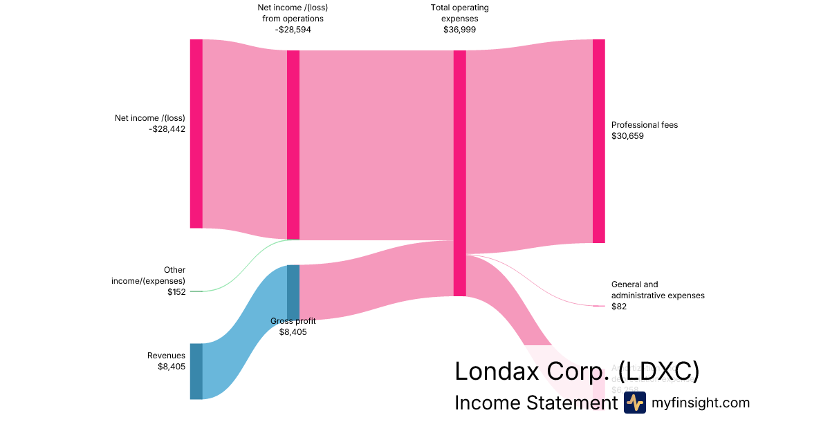 For the quarter ending 2025-11-30, LDXC made $8,405 in revenue. -$28,442 in net income. Net profit margin of -338.39%.