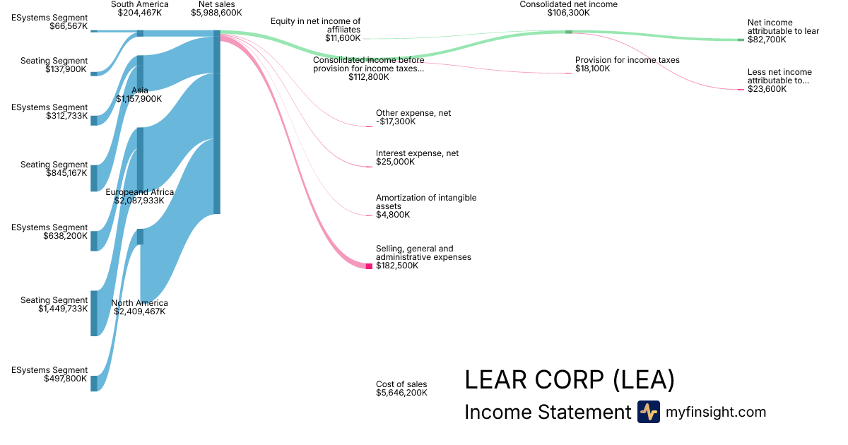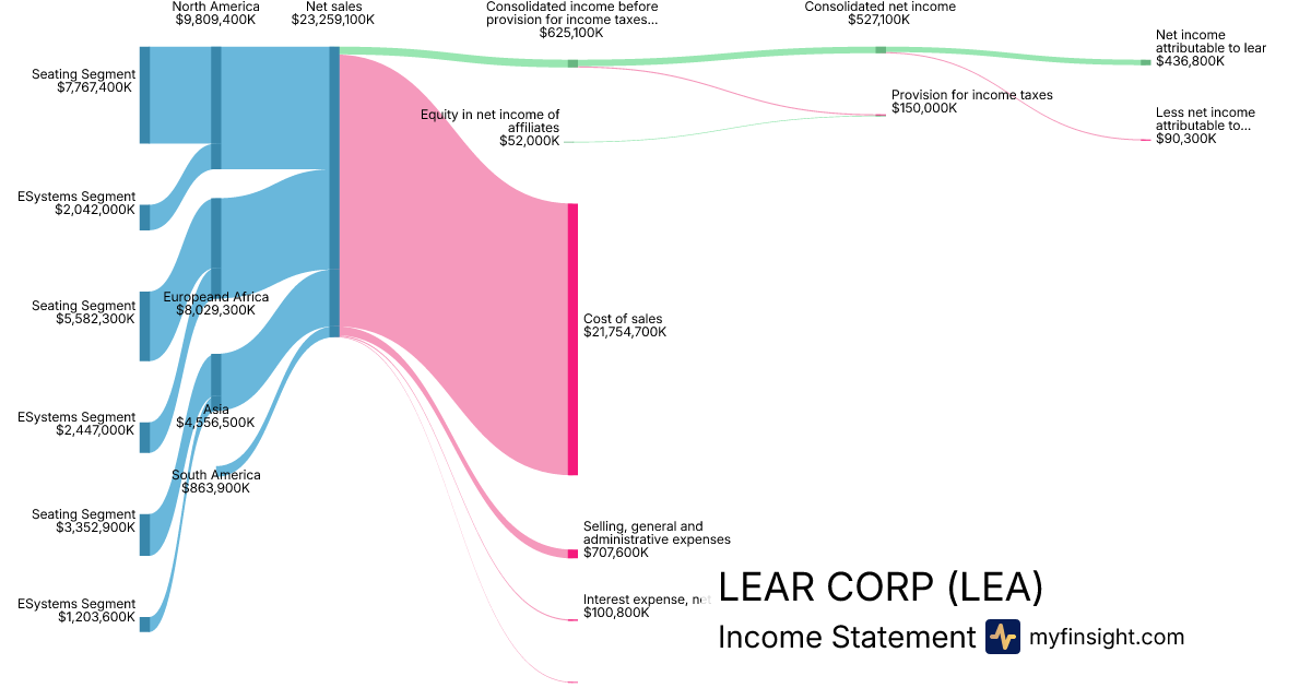 For the year ending 2025-12-31, LEA made $23,259,100K in revenue. $436,800K in net income. Net profit margin of 1.88%.