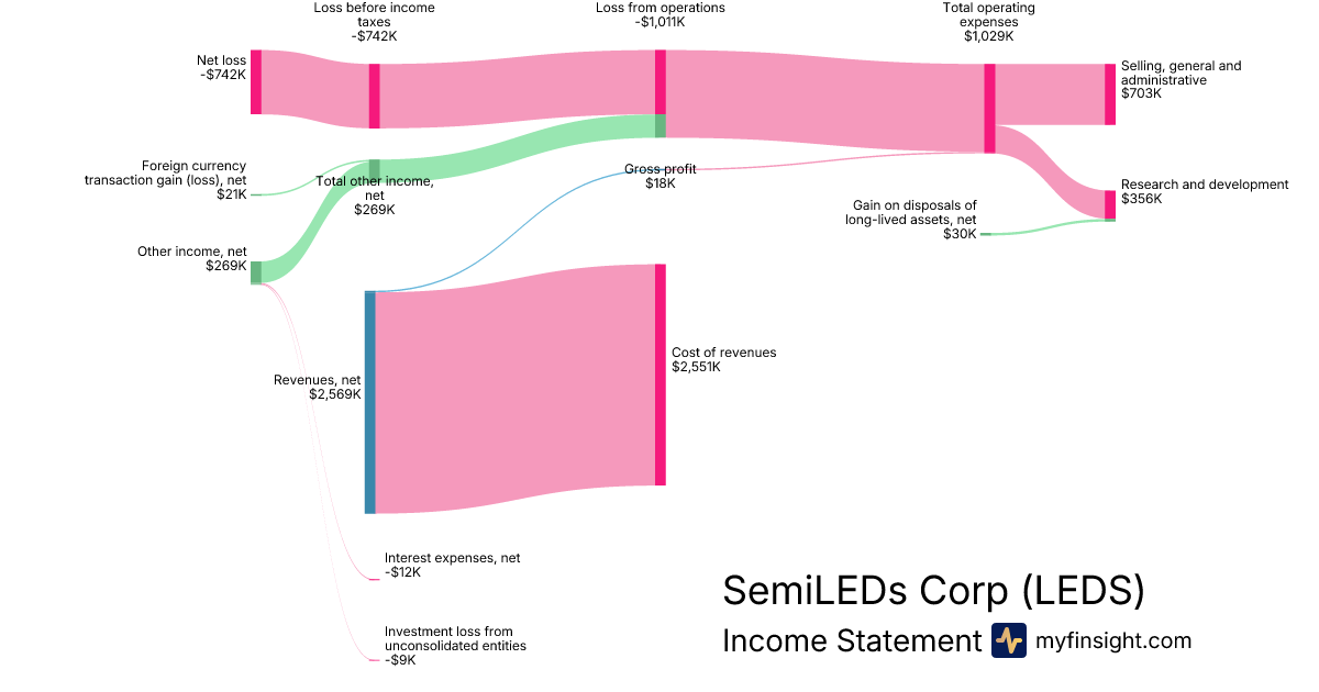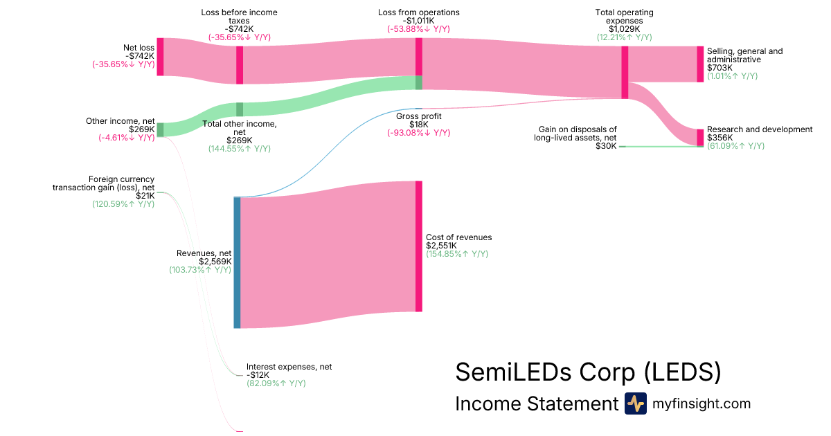 For the quarter ending 2025-11-30, LEDS made $2,569K in revenue. -$742K in net income. Net profit margin of -28.88%.