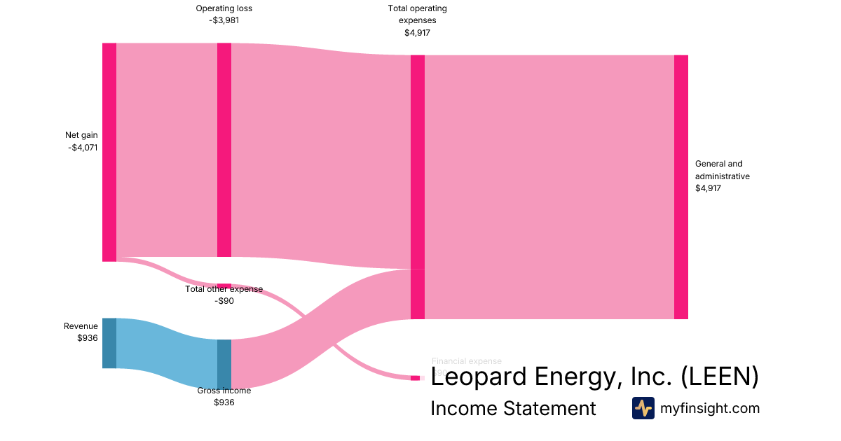 For the quarter ending 2026-01-31, LEEN made $936 in revenue. -$4,071 in net income. Net profit margin of -434.94%.
