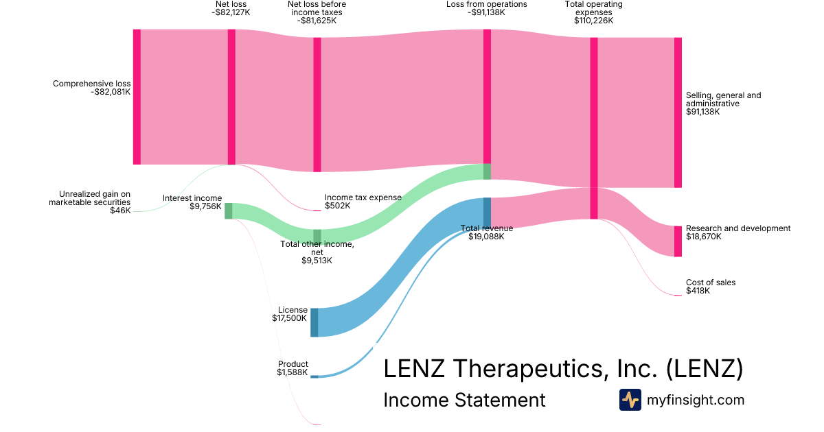 For the year ending 2025-12-31, LENZ made $19,088K in revenue. -$82,081K in net income. Net profit margin of -430.01%.