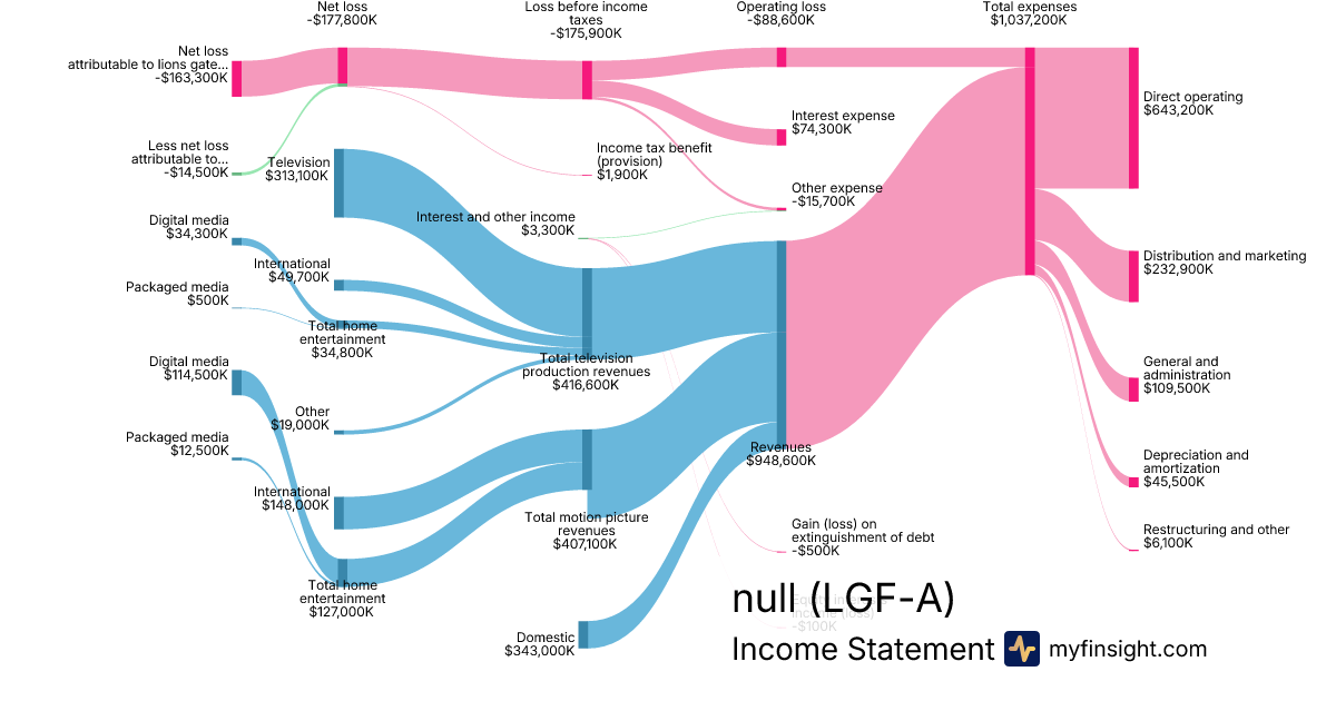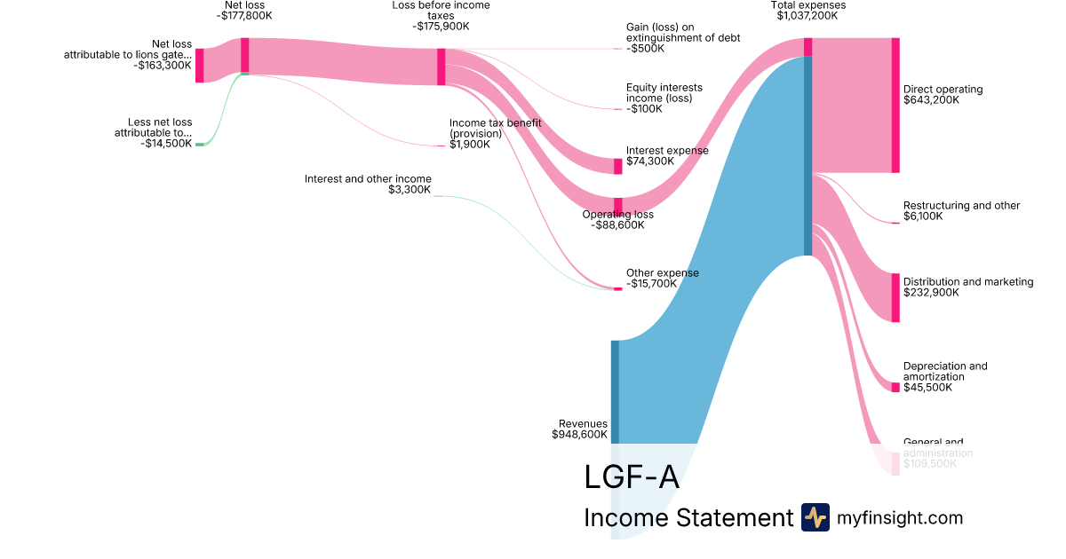 For the quarter ending 2024-09-30, LGF-A made $948,600K in revenue. -$163,300K in net income. Net profit margin of -17.21%.