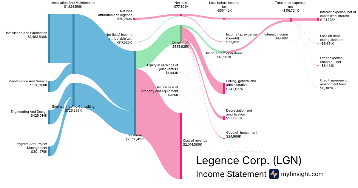 For the year ending 2025-12-31, LGN made $2,550,491K in revenue. -$59,780K in net income. Net profit margin of -2.34%.