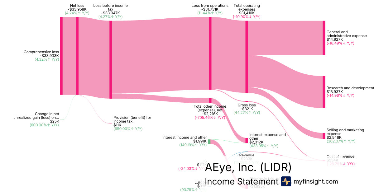 For the year ending 2025-12-31, LIDR made $233K in revenue. -$33,933K in net income. Net profit margin of -14563.52%.