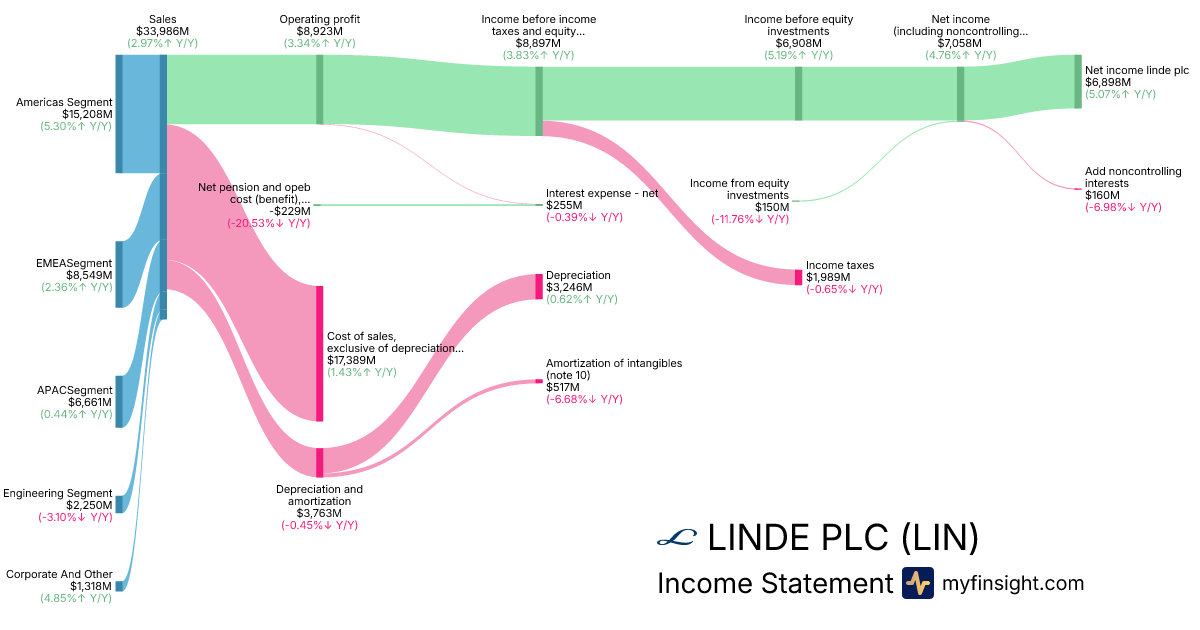 For the year ending 2025-12-31, LIN made $33,986M in revenue. $6,898M in net income. Net profit margin of 20.30%.