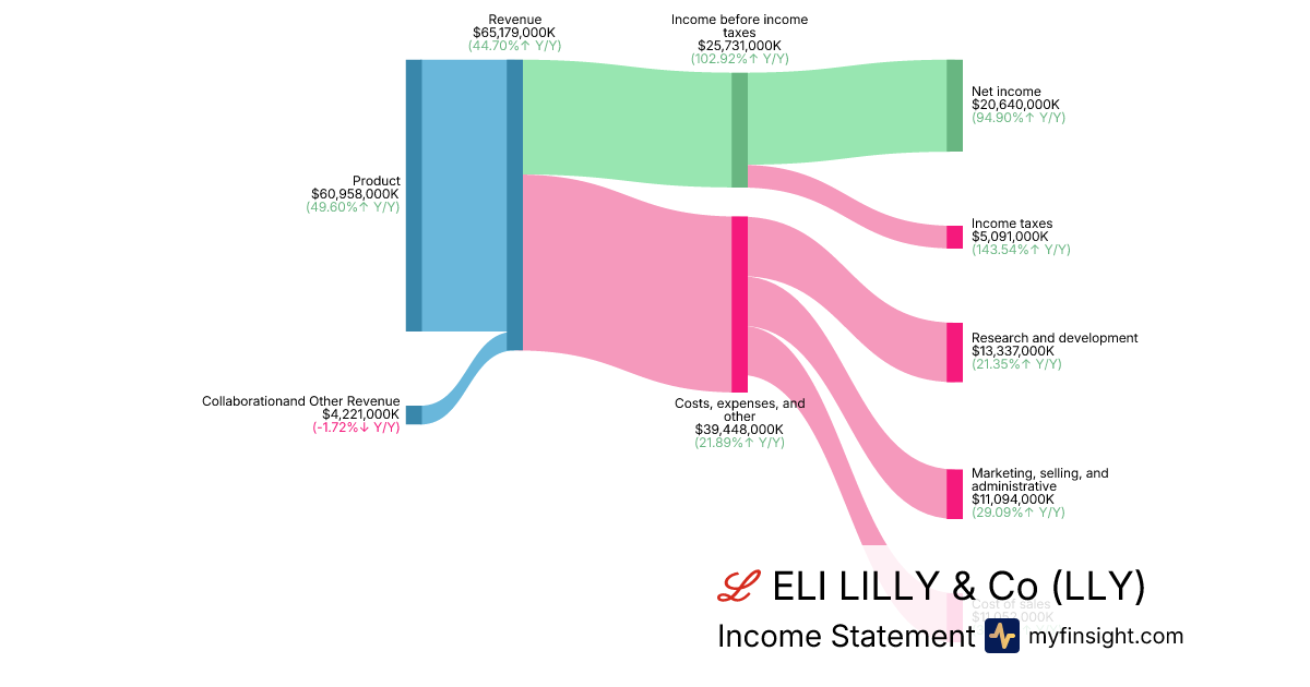 For the year ending 2025-12-31, LLY made $65,179,000K in revenue. $20,640,000K in net income. Net profit margin of 31.67%.