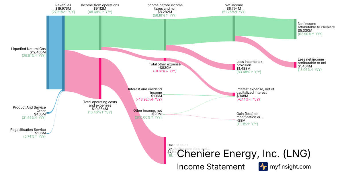 For the year ending 2025-12-31, LNG made $19,976M in revenue. $5,330M in net income. Net profit margin of 26.68%.