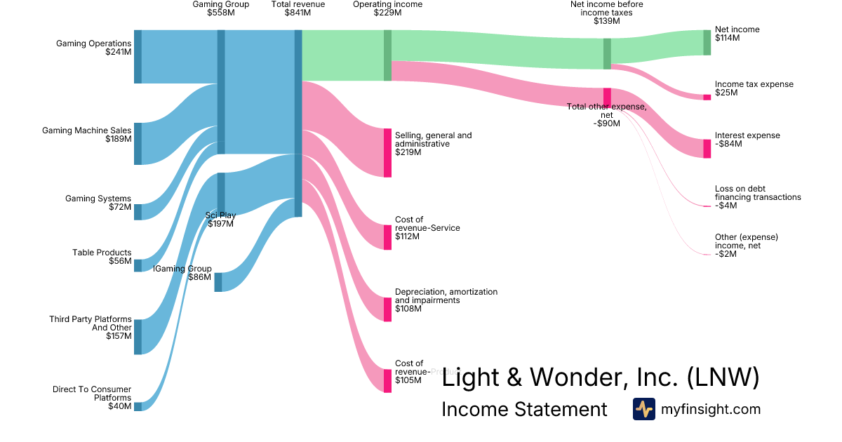 For the quarter ending 2025-09-30, LNW made $841M in revenue. $114M in net income. Net profit margin of 13.56%.