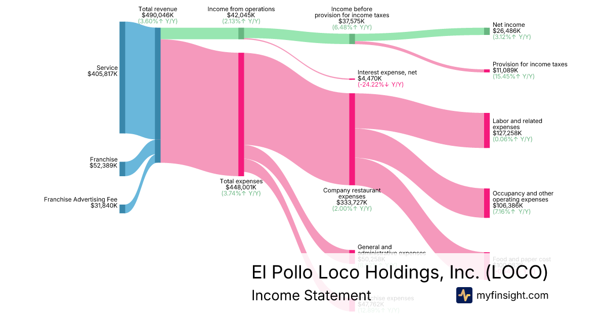 For the year ending 2025-12-31, LOCO made $490,046K in revenue. $26,486K in net income. Net profit margin of 5.40%.