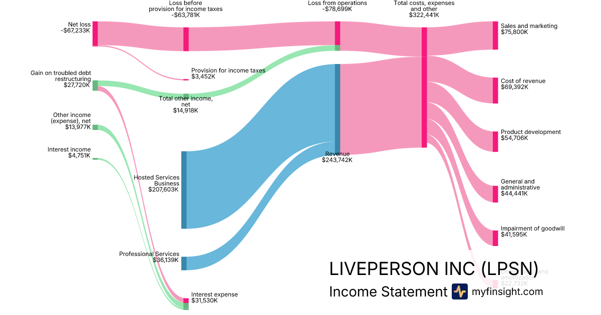 For the year ending 2025-12-31, LPSN made $243,742K in revenue. -$67,233K in net income. Net profit margin of -27.58%.