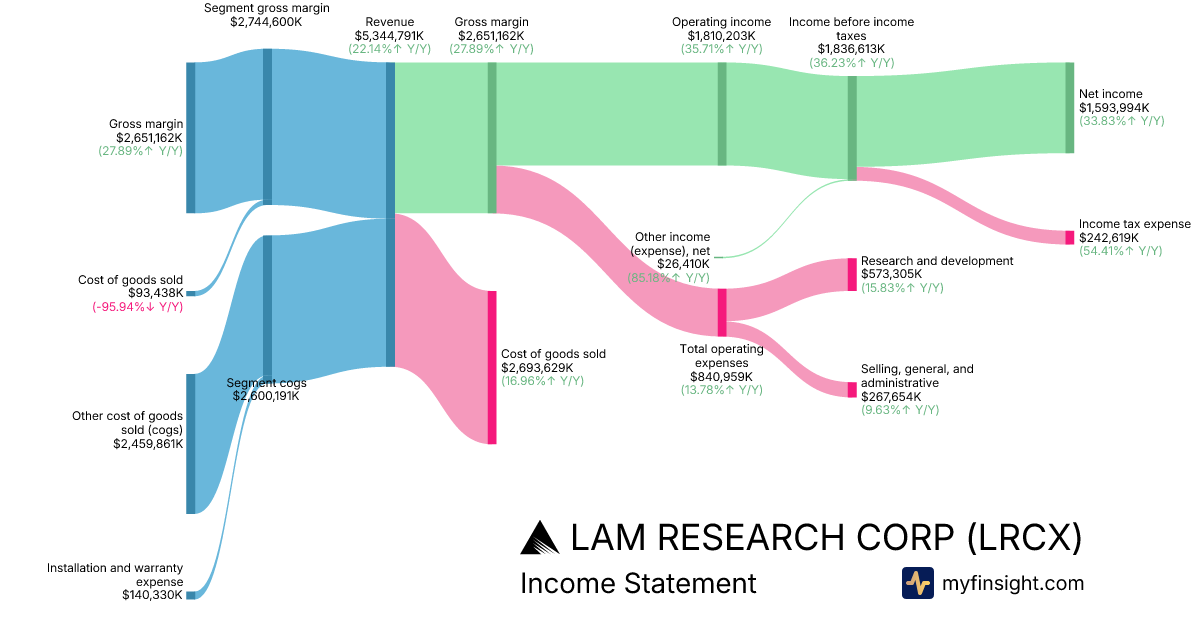 For the quarter ending 2025-12-28, LRCX made $5,344,791K in revenue. $1,593,994K in net income. Net profit margin of 29.82%.