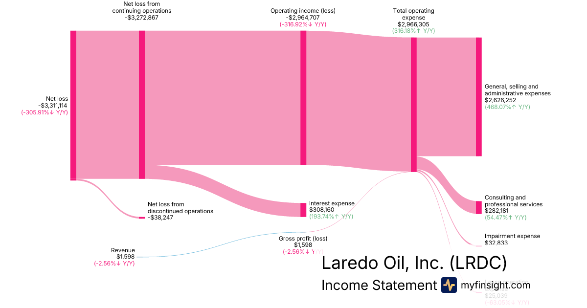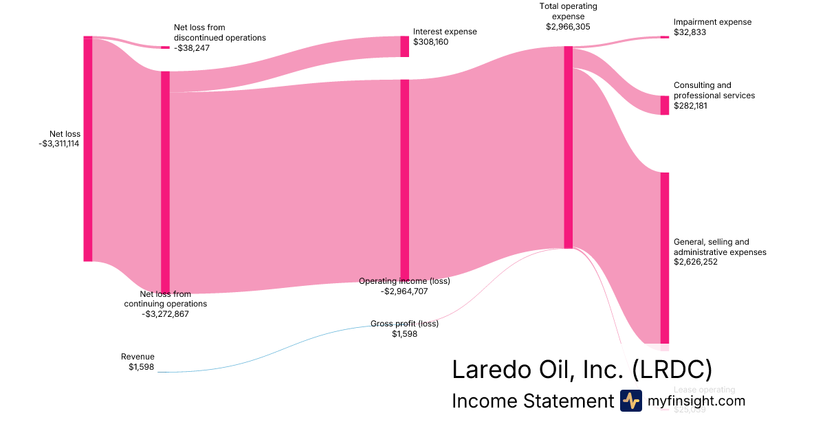 For the quarter ending 2025-11-30, LRDC made $1,598 in revenue. -$3,311,114 in net income. Net profit margin of -207203.63%.