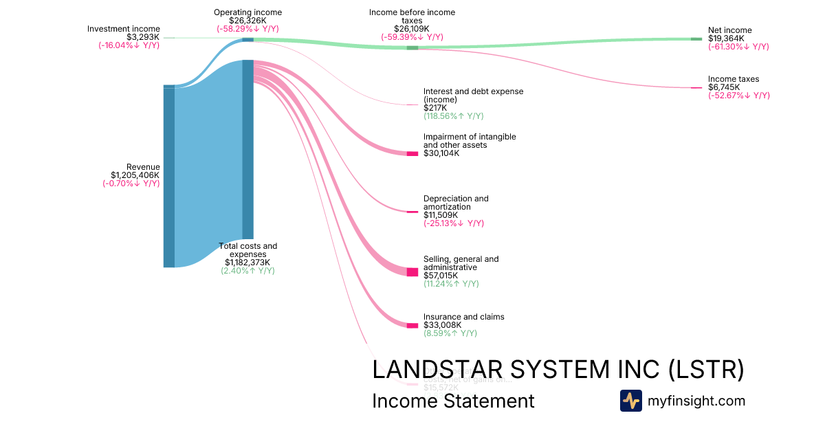 For the quarter ending 2025-09-27, LSTR made $1,205,406,000 in revenue. $19,364,000 in net income. Net profit margin of 1.61%.
