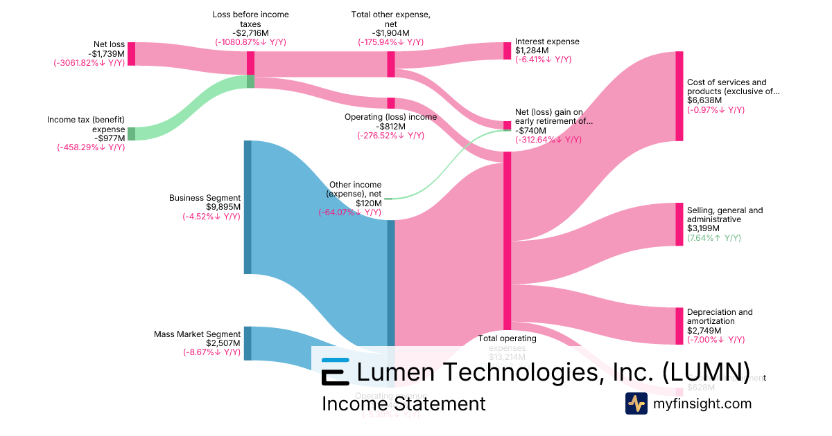 For the year ending 2025-12-31, LUMN made $12,402M in revenue. -$1,739M in net income. Net profit margin of -14.02%.