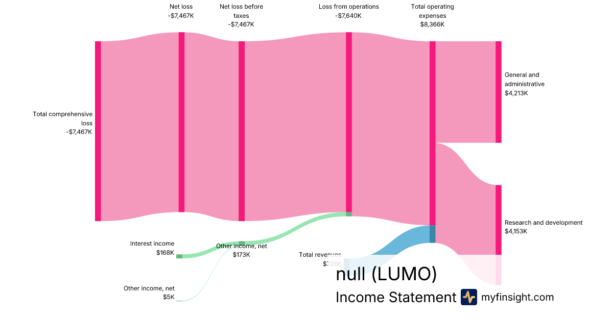 For the quarter ending 2024-09-30, LUMO made $726K in revenue. -$7,467K in net income. Net profit margin of -1028.51%.