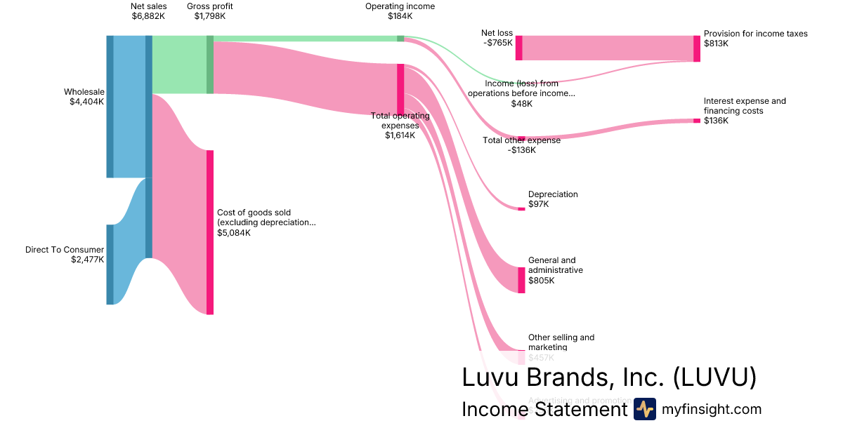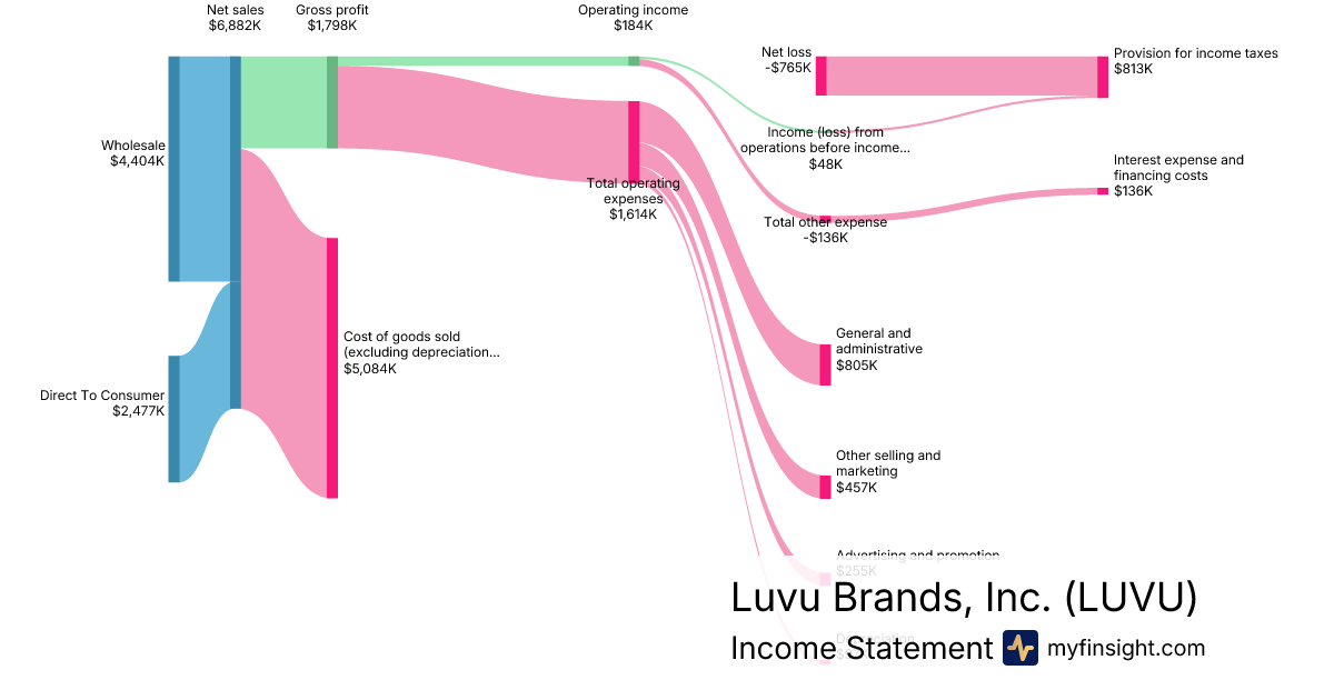 For the quarter ending 2025-12-31, LUVU made $6,882K in revenue. -$765K in net income. Net profit margin of -11.12%.