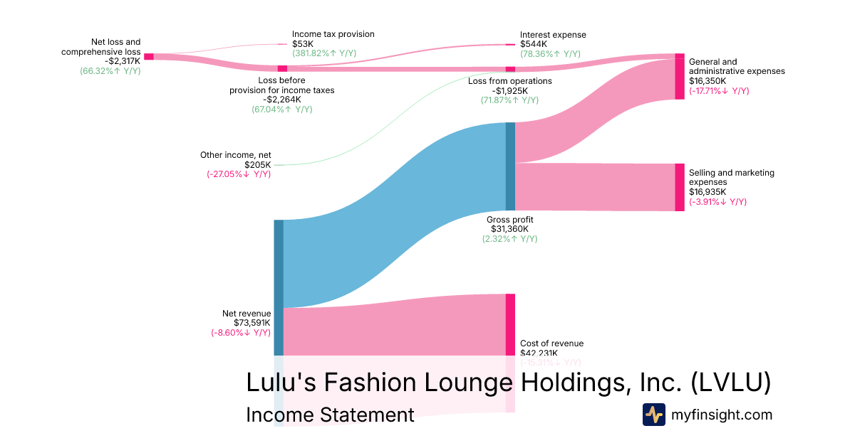 For the quarter ending 2025-09-28, LVLU made $73,591,000 in revenue. -$2,317,000 in net income. Net profit margin of -3.15%.